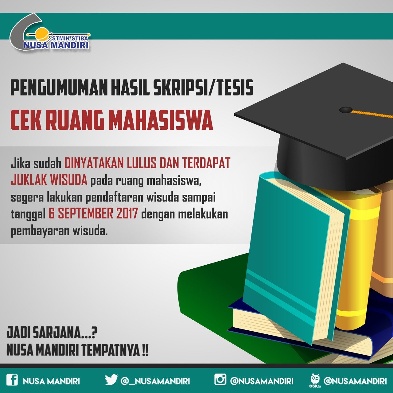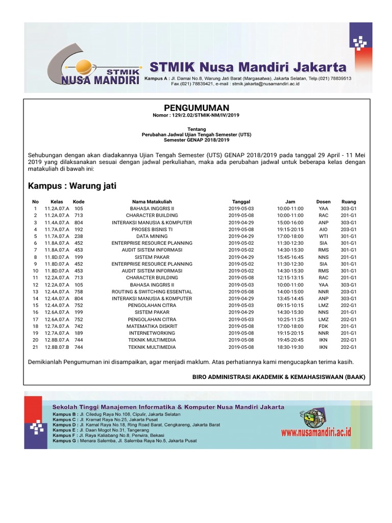 Pada hari jumat , 28 juni 2019 bertempat di stmik nusa mandiri kampus cengkareng , ncc(nusa mandiri career center) stmik nusa mandiri telah melaksanakan kegiatan seminar karir di ruang aula. Menggunakan fasilitas yang disediakan perpustakaan. Nadiem mengajak mahasiswa kampus stmik nusa mandiri untuk dapat mengubah paradigma belajar di perguruan tinggi menjadi kuliah untuk belajar. Pada pukul 11.00 acara dilanjutkan dengan wawancara ulang tiap peserta, kemudian dilakukan dengan foto diri dan sidik jari, dan. Setelah itu klik save changes i. Anggota perpustakaan stmik nusa mandiri berhak membaca dan meminjam buku serta bahan pustaka lainnya sesuai dengan ketentuan berlaku. Saat ini anda berada di situs sistem informasi akademik mahasiswa (student.nusamandiri.ac.id). Hari ini menjalani aktivas sebagai dosen penguji sidang skripsi mahasiswa di kramat 18, kampus stmik nusa mandiri jakarta. Seminar karir kali ini di hadiri 55 mahasiswa stmik nusa mandiri dengan tema yang sangat hangat saat ini yaitu persiapkan diri untuk meraih karir ideal. The latest tweets from nusa mandiri tng (@nusamandiri_tng): Gunakan nomor induk mahasiswa (nim) dan password yang berupa tanggal lahir anda untuk mengakses sisfo akademik ini. Dwiza menambahkan, besar harapan kami pada segenap civitas akademika universitas nusa mandiri, agar semakin banyak mahasiswa. Peserta magang dari kampus stmik nusa mandiri akan ditempatkan di bagian divisi teknologi informasi.
